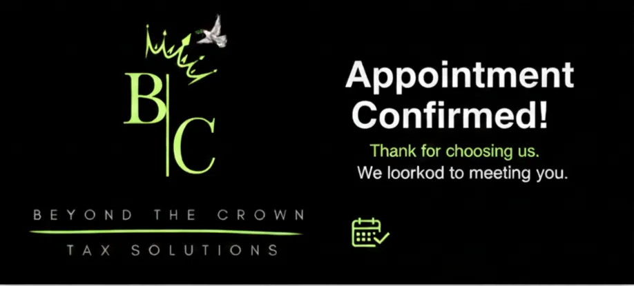 Find a time to connect with us! This call is dedicated to discovering how Beyond The Crown Tax Solutions can maximize your refund and simplify your tax season. Just 15 minutes, and you’ll be on your way to a stress-free filing experience.